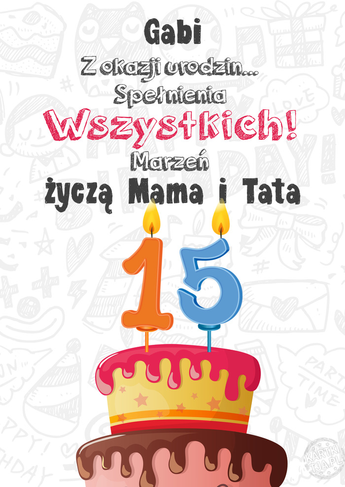 Gabi ❤️ Kartka z okazji 15 urodzin, życzą Mama i Tata