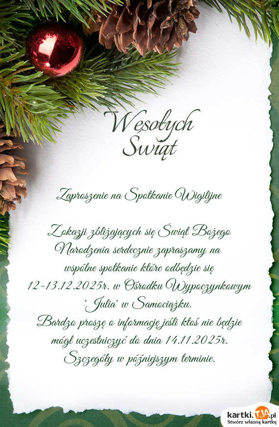 Wspólne spotkanie które odbędzie się 12-13.12.2025r. w Ośrodku Wypoczynkowym "Julia" w Samocią