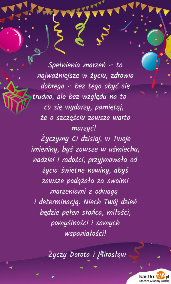 Spełnienia marzeń – to najważniejsze w życiu, zdrowia dobrego – bez tego obyć się trudno, ale bez względu na to co się wydarzy, pamiętaj,