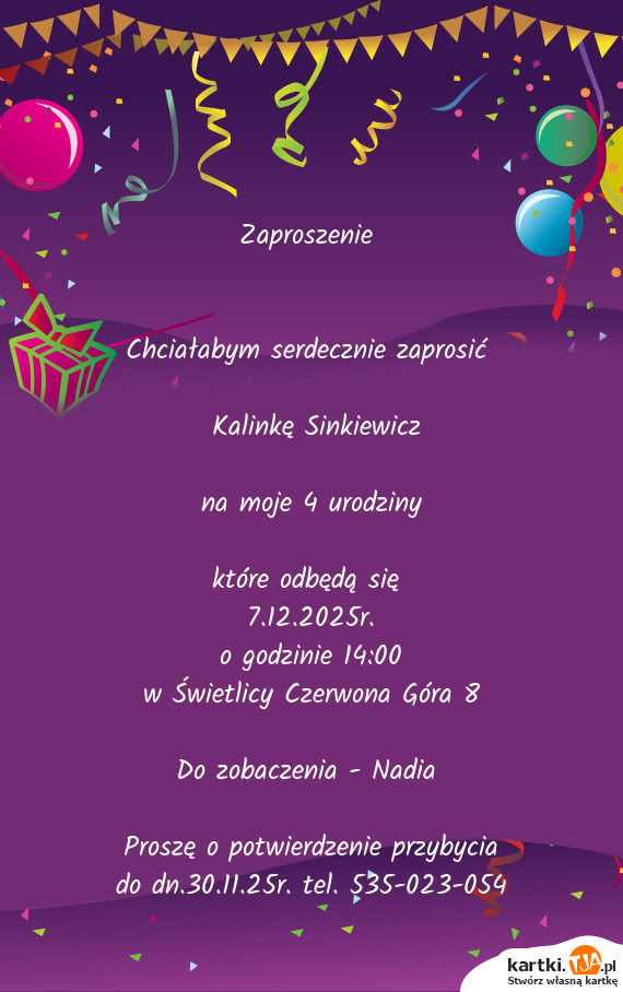 Proszę o potwierdzenie przybycia do dn.30.11.25r. tel. 535-023-054