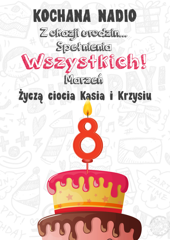 KOCHANA NADIO Kartka z okazji 8 urodzin, Życzą ciocia Kasia i Krzysiu
