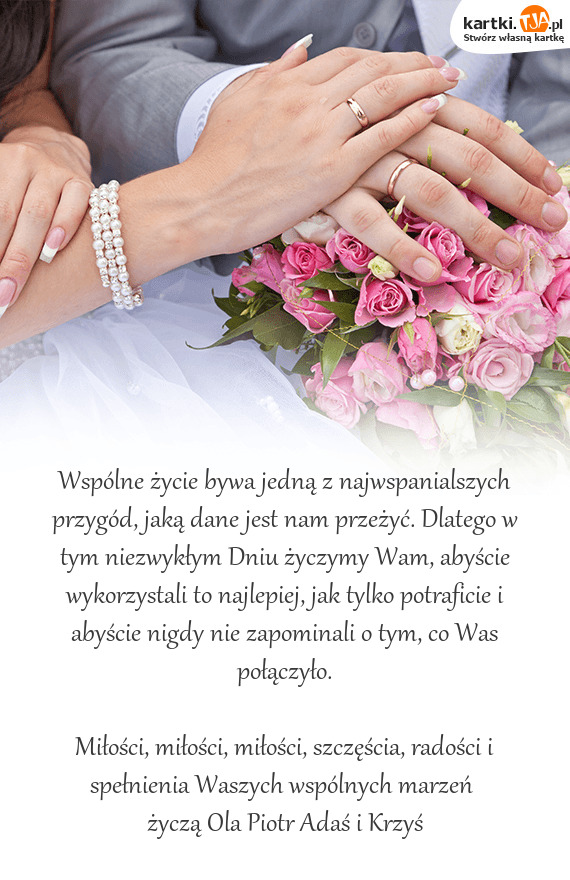 Wspólne życie bywa jedną z najwspanialszych przygód, jaką dane jest nam przeżyć. Dlatego w tym niezwykłym Dniu życzymy Wam, abyście wykorzystali to najlepiej, jak tylko potraficie i abyście nigdy nie zapominali o tym, co Was połączyło.