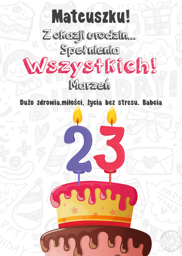 Mateuszku! Kartka z okazji 23 urodzin, Dużo zdrowia,miłości, życia bez stresu. Babcia