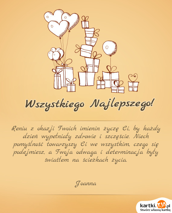 Reniu z okazji Twoich imienin życzę Ci, by każdy dzień wypełniały zdrowie i szczęście. Niech pomyślność towarzyszy Ci we wszystkim, czego się podejmiesz, a Twoja odwaga i determinacja były światłem na ścieżkach życia.