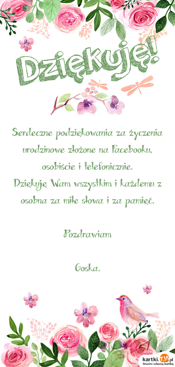Serdeczne podziękowania za życzenia urodzinowe złożone na Facebooku,