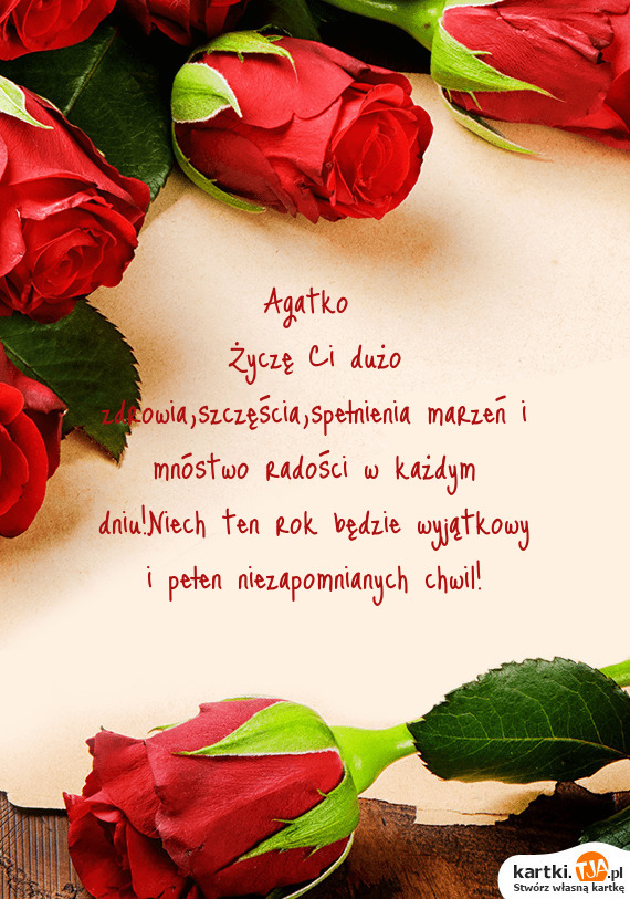Życzę Ci dużo zdrowia,szczęścia,spełnienia marzeń i mnóstwo radości w każdym dniu!Niech ten rok będzie wyjątkowy i pełen niezapomnianych chwil!