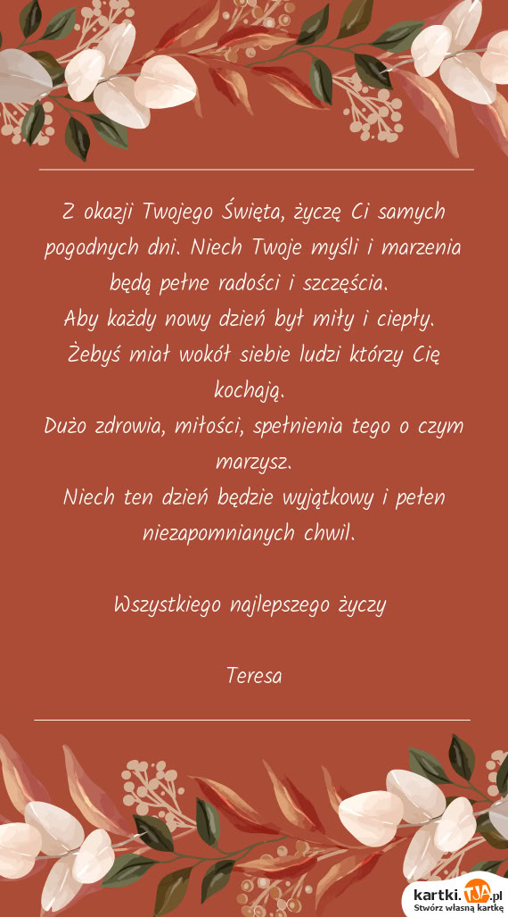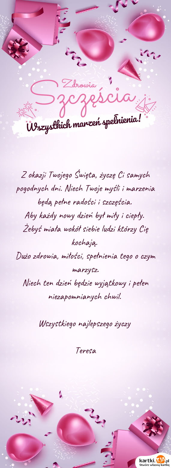 Bardzo przydatną opcją, dla tych osób które nie mają czasu lub po prostu nie chcą tworzyć własnej kartki, jest możliwość wybrania gotowych wzorów, również uporządkowanych według okazji. Jest ich naprawdę wiele, szczególnie tych z okazji popularnych świąt, więc z pewnością każdy wyszuka coś odpowiedniego. Jeżeli mamy zamiar powracać na stronę kartki.tja.pl i tworzyć kolejne kartki dla naszych bliskich, warto stworzyć własne konto. Dzięki temu po zalogowaniu się znajdziemy je wszystkie w zakładce " Moje kartki" i będziemy mogli skorzystać z nich ponownie.