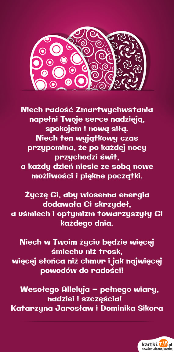 Bardzo przydatną opcją, dla tych osób które nie mają czasu lub po prostu nie chcą tworzyć własnej kartki, jest możliwość wybrania gotowych wzorów, również uporządkowanych według okazji. Jest ich naprawdę wiele, szczególnie tych z okazji popularnych świąt, więc z pewnością każdy wyszuka coś odpowiedniego. Jeżeli mamy zamiar powracać na stronę kartki.tja.pl i tworzyć kolejne kartki dla naszych bliskich, warto stworzyć własne konto. Dzięki temu po zalogowaniu się znajdziemy je wszystkie w zakładce " Moje kartki" i będziemy mogli skorzystać z nich ponownie.