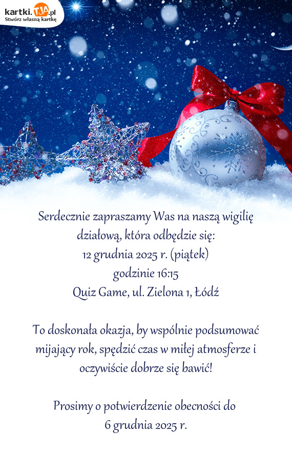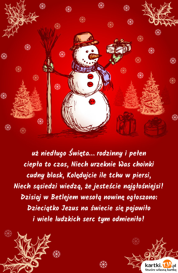 Serdecznie zapraszamy do skorzystania z naszej strony Kartki.tja.pl, i podtrzymywania tradycji świąt bożego narodzenia, związanym z wysyłaniem swoim bliskim kartek świątecznych i noworocznych.