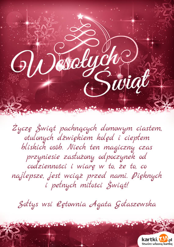 Życzę Świąt pachnących domowym ciastem, otulonych dźwiękiem kolęd i ciepłem bliskich osób