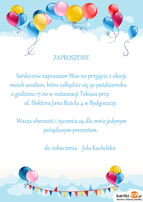 Serdecznie zapraszam Was na przyjęcie z okazji moich urodzin, które odbędzie się 30 październik