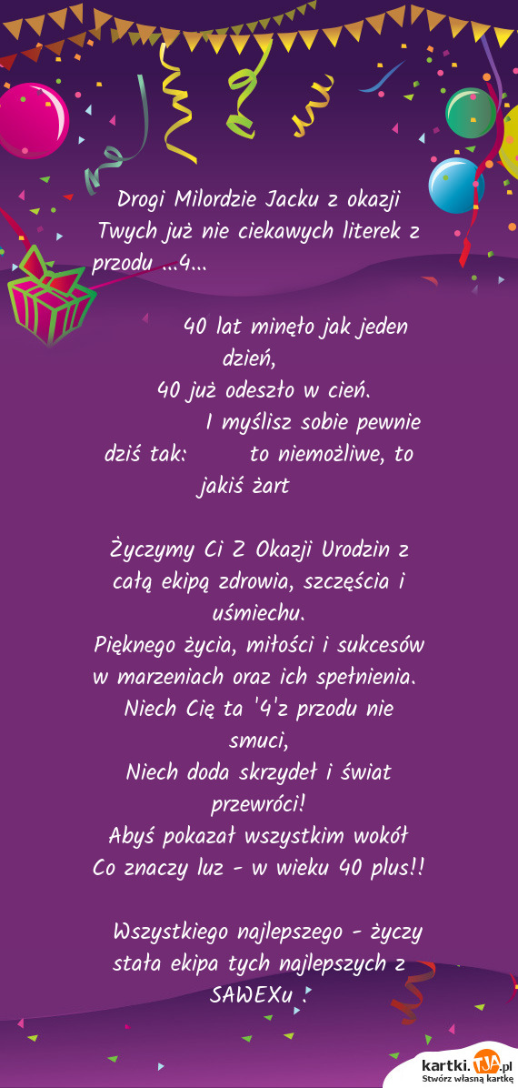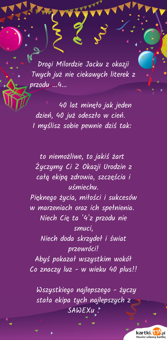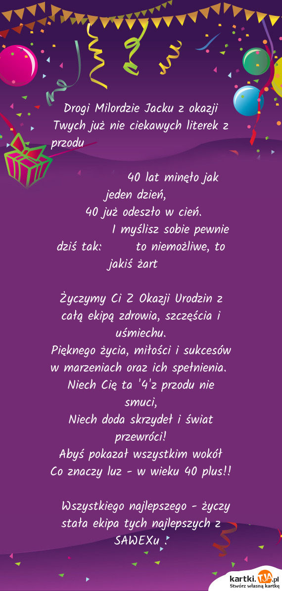 Drogi Milordzie Jacku z okazji Twych już nie ciekawych literek z przodu 🎂🎂🥂🥂🥂