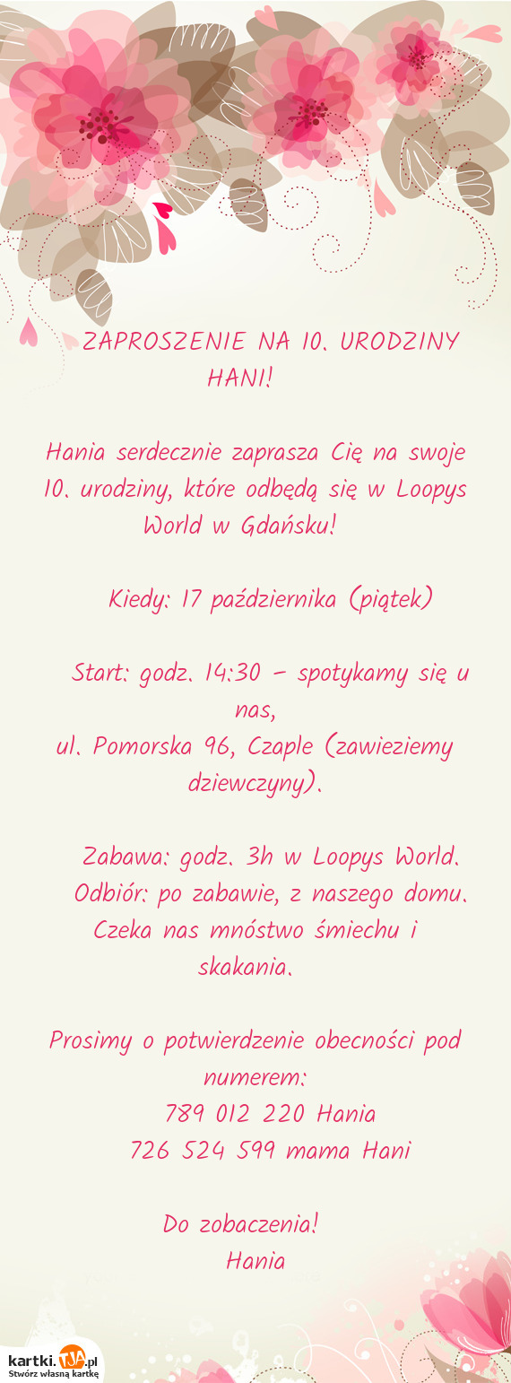 Hania serdecznie zaprasza Cię na swoje 10. urodziny, które odbędą się w Loopys World w Gdańsku
