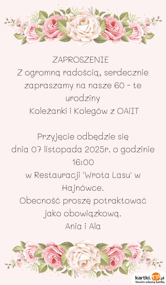 Z ogromną radością, serdecznie zapraszamy na nasze 60 - te urodziny