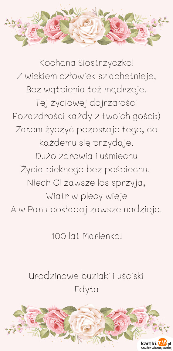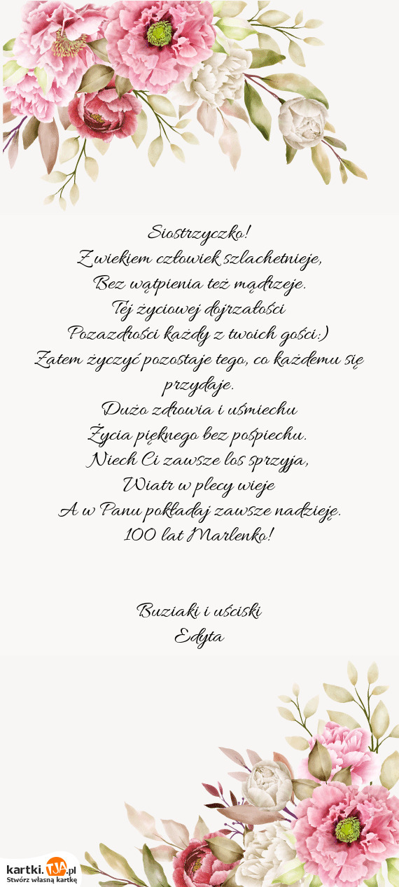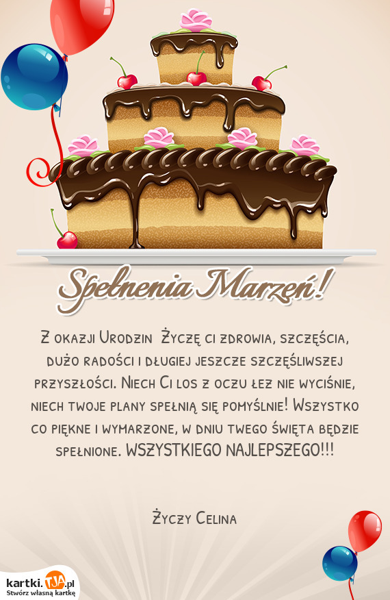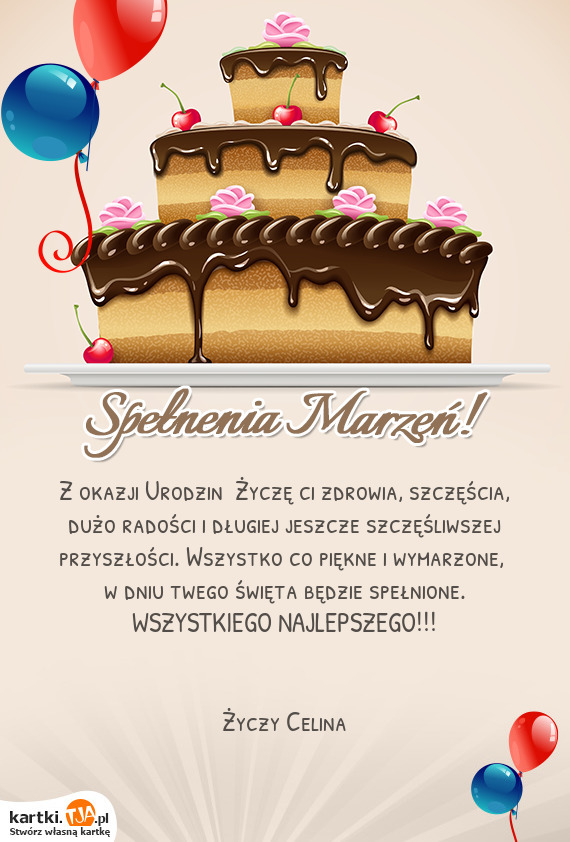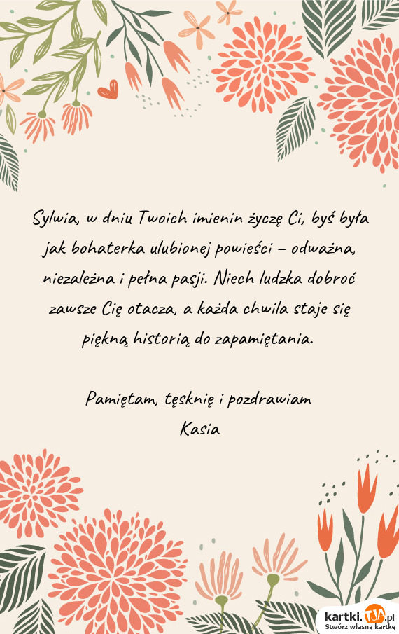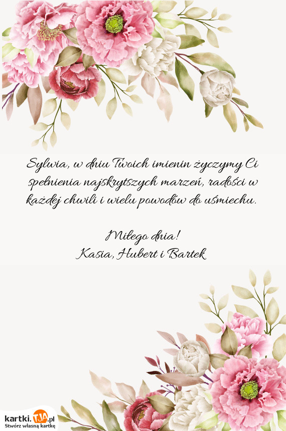 Do każdej kartki imieninowej dołączamy również uniwersalne życzenia imieninowe ? wystarczy jedynie pod nimi podpisać się. Z powodzeniem tekst życzeń można jednak dowolnie edytować. Dzięki temu, uniwersalną formułkę może zastąpić zabawny wierszyk, fragment ulubionej piosenki solenizanta bądź samodzielnie ułożone życzenia na imieniny płynące prosto z serca wysyłającego. Dzięki naszym kartkom, każdy może zrobić miłą niespodziankę bliskim w dniu ich imienin. Bez kupowania kartek, biegania na pocztę i naklejania znaczków.