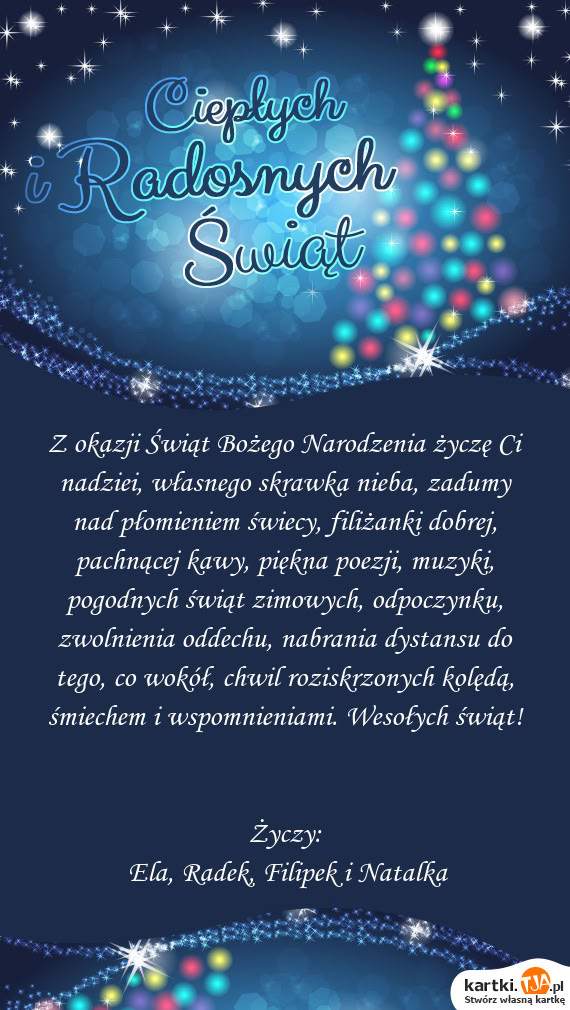 Z okazji Świąt Bożego Narodzenia życzę Ci nadziei, własnego skrawka nieba, zadumy nad płomieniem świecy, filiżanki dobrej, pachnącej kawy, piękna poezji, muzyki, pogodnych świąt zimowych, odpoczynku, zwolnienia oddechu, nabrania dystansu do tego, co wokół, chwil roziskrzonych kolędą, śmiechem i wspomnieniami. Wesołych świąt!