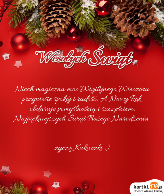 Niech magiczna moc Wigilijnego Wieczoru przyniesie spokój i radość. A Nowy Rok obdaruje pomyślnością i szczęściem. Najpiękniejszych Świąt Bożego Narodzenia