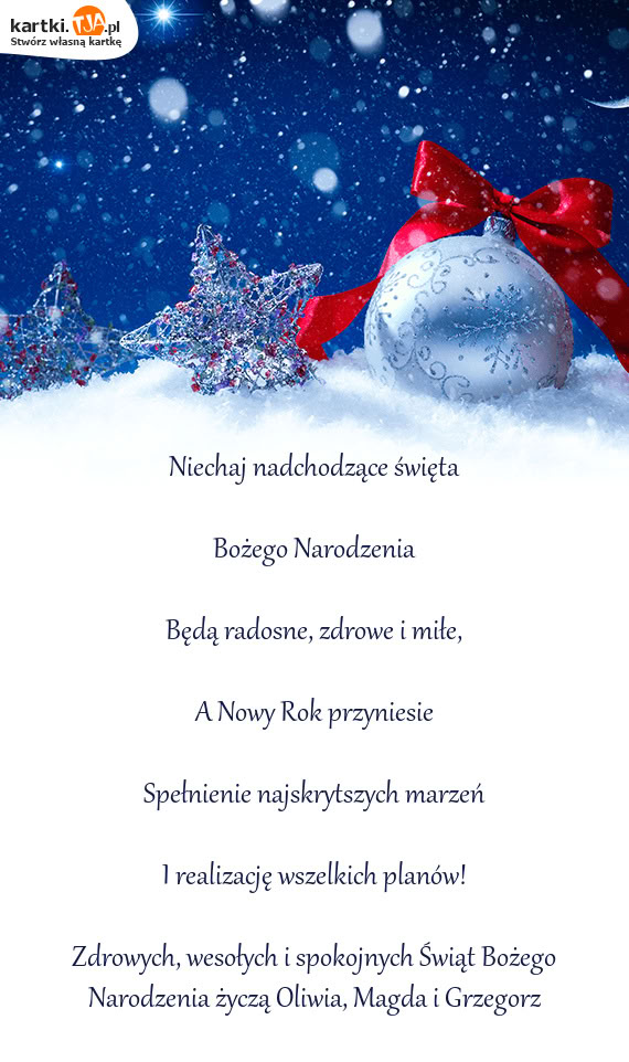 Zdrowych, wesołych i spokojnych Świąt Bożego Narodzenia życzą Oliwia, Magda i Grzegorz