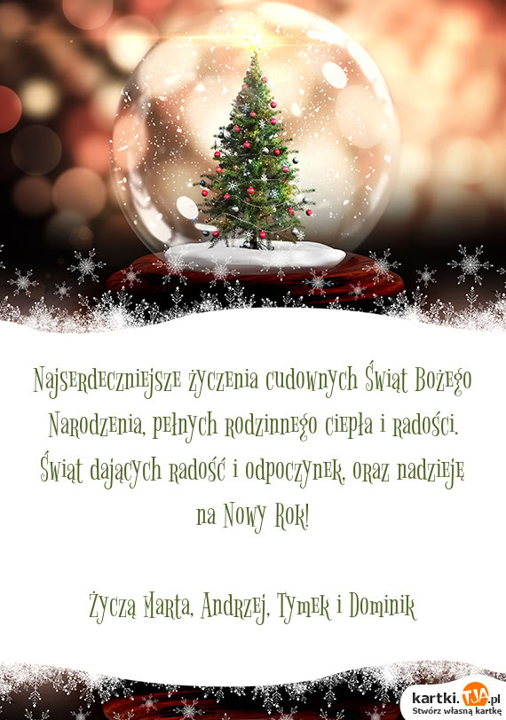 Najserdeczniejsze życzenia cudownych Świąt Bożego Narodzenia, pełnych rodzinnego ciepła i radości. Świąt dających radość i odpoczynek, oraz nadzieję na Nowy Rok!