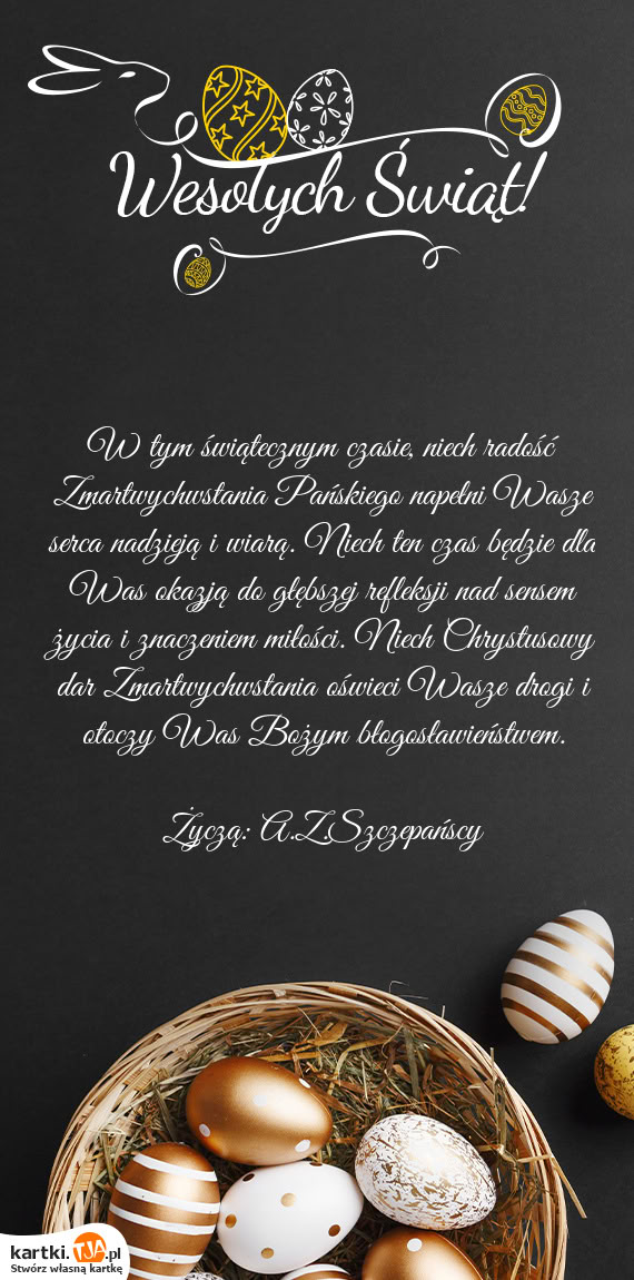 W tym świątecznym czasie, niech radość Zmartwychwstania Pańskiego napełni Wasze serca nadzieją i wiarą. Niech ten czas będzie dla Was okazją do głębszej refleksji nad sensem życia i znaczeniem miłości. Niech Chrystusowy dar Zmartwychwstania oświeci Wasze drogi i otoczy Was Bożym błogosławieństwem.