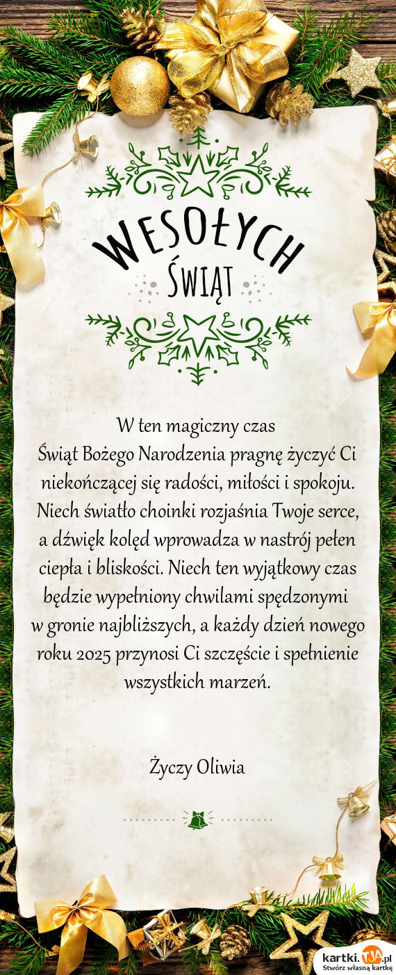 Świąt Bożego Narodzenia pragnę życzyć Ci niekończącej się radości, miłości i spokoju. Niech światło choinki rozjaśnia Twoje serce,
