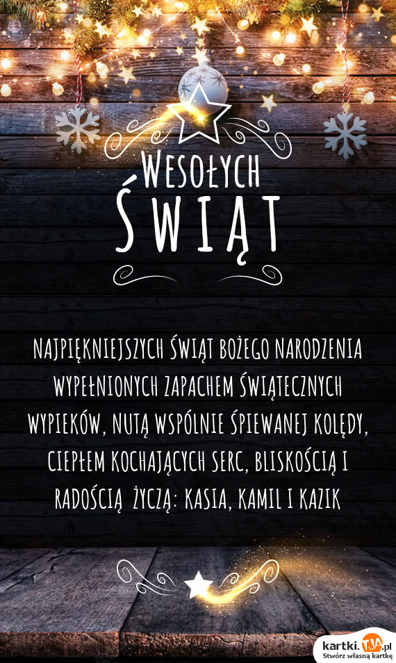 NAJPIĘKNIEJSZYCH ŚWIĄT BOŻEGO NARODZENIA WYPEŁNIONYCH ZAPACHEM ŚWIĄTECZNYCH WYPIEKÓW, NUTĄ WSPÓLNIE ŚPIEWANEJ KOLĘDY, CIEPŁEM KOCHAJĄCYCH SERC, BLISKOŚCIĄ I RADOŚCIĄ ŻYCZĄ: KASIA, KAMIL I KAZIK