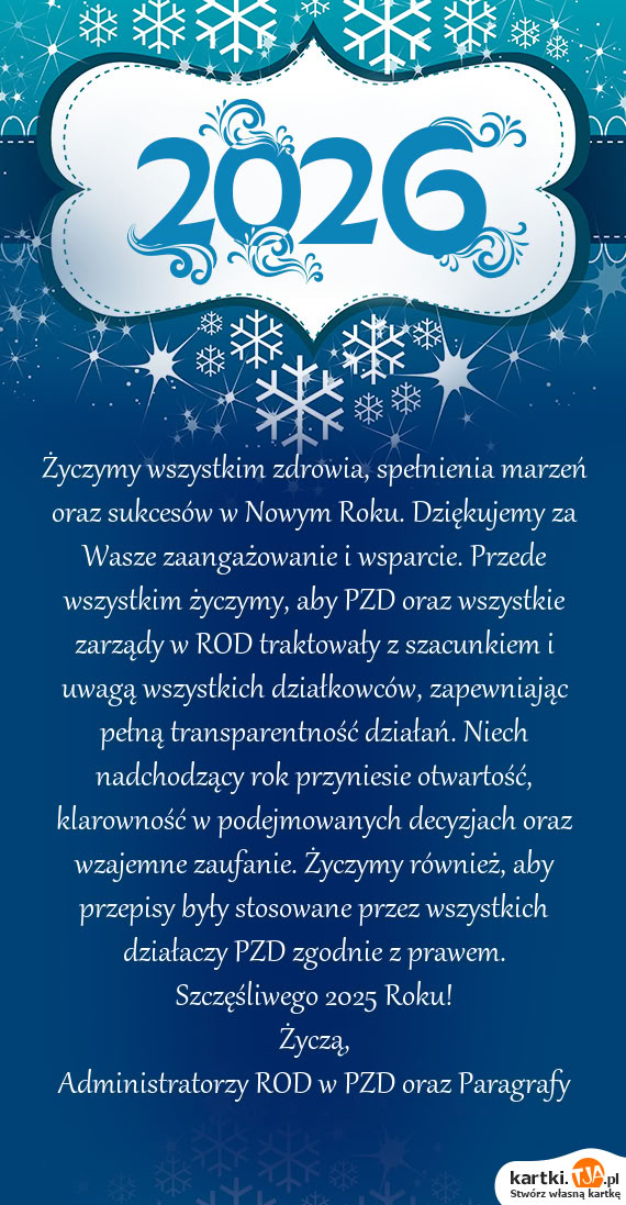 Życzymy wszystkim zdrowia, spełnienia marzeń oraz sukcesów w Nowym Roku. Dziękujemy za Wasze zaangażowanie i wsparcie. Przede wszystkim życzymy, aby PZD oraz wszystkie zarządy w ROD traktowały z szacunkiem i uwagą wszystkich działkowców, zapewniając pełną transparentność działań. Niech nadchodzący rok przyniesie otwartość, klarowność w podejmowanych decyzjach oraz wzajemne zaufanie. Życzymy również, aby przepisy były stosowane przez wszystkich działaczy PZD zgodnie z prawem.