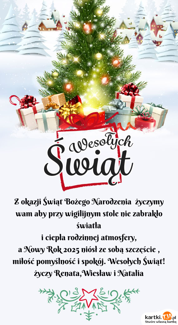 a Nowy Rok 2025 niósł ze sobą szczęście , miłość pomyślność i spokój. Wesołych Świąt! życzy Renata,Wiesław i Natalia