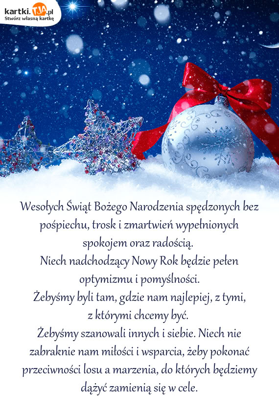 Wesołych Świąt Bożego Narodzenia spędzonych bez pośpiechu, trosk i zmartwień wypełnionych spokojem oraz radością.
