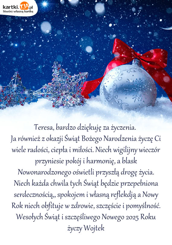 Ja również z okazji Świąt Bożego Narodzenia życzę Ci wiele radości, ciepła i miłości. Niech wigilijny wieczór przyniesie pokój i harmonię, a blask Nowonarodzonego oświetli przyszłą drogę życia. Niech każda chwila tych Świąt będzie przepełniona serdecznością,, spokojem i własną reflekdją a Nowy Rok niech obfituje w zdrowie, szczęście i pomyślność. Wesołych Świąt i szczęśliwego Nowego 2025 Roku