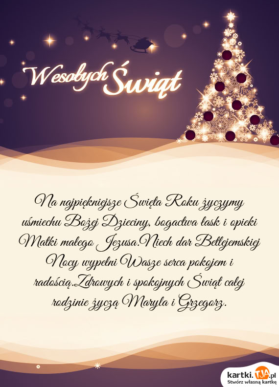 Na najpiękniejsze Święta Roku życzymy uśmiechu Bożej Dzieciny, bogactwa łask i opieki Matki małego Jezusa.Niech dar Betlejemskiej Nocy wypełni Wasze serca pokojem i radością.Zdrowych i spokojnych Świąt całej rodzinie życzą Maryla i Grzegorz.