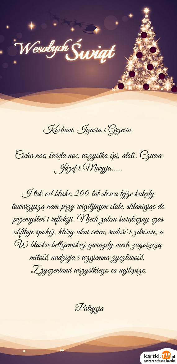 I tak od blisko 200 lat słowa tejże kolędy towarzyszą nam przy wigilijnym stole, skłaniając do przemyśleń i refleksji. Niech zatem świąteczny czas obfituje spokój, który ukoi serca, radość i zdrowie, a W blasku betlejemskiej gwiazdy niech zagoszczą miłość, nadzieja i wzajemna życzliwość.