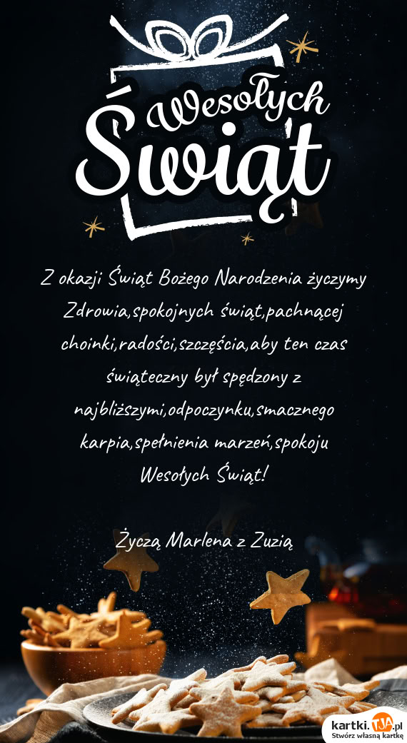Z okazji Świąt Bożego Narodzenia życzymy Zdrowia,spokojnych świąt,pachnącej choinki,radości,szczęścia,aby ten czas świąteczny był spędzony z najbliższymi,odpoczynku,smacznego karpia,spełnienia marzeń,spokoju