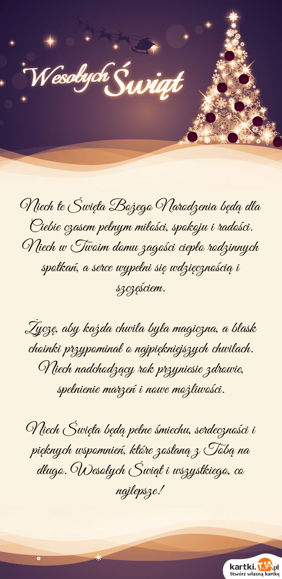 Życzę, aby każda chwila była magiczna, a blask choinki przypominał o najpiękniejszych chwilach. Niech nadchodzący rok przyniesie zdrowie, spełnienie marzeń i nowe możliwości.