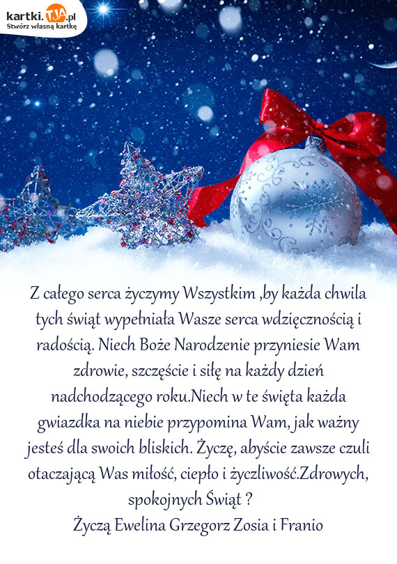 Z całego serca życzymy Wszystkim ,by każda chwila tych świąt wypełniała Wasze serca wdzięcznością i radością. Niech Boże Narodzenie przyniesie Wam zdrowie, szczęście i siłę na każdy dzień nadchodzącego roku.Niech w te święta każda gwiazdka na niebie przypomina Wam, jak ważny jesteś dla swoich bliskich. Życzę, abyście zawsze czuli otaczającą Was miłość, ciepło i życzliwość.Zdrowych, spokojnych Świąt ?❤️