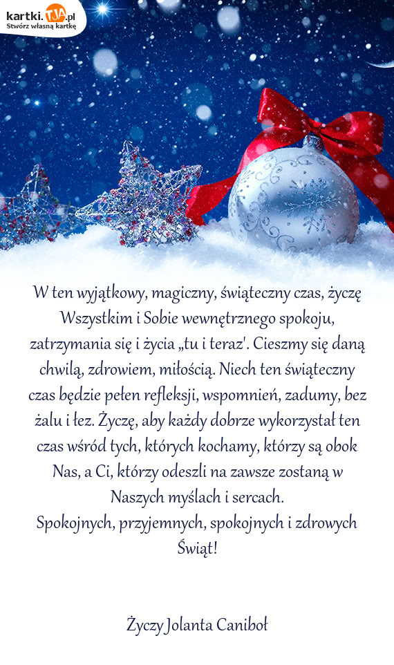 W ten wyjątkowy, magiczny, świąteczny czas, życzę Wszystkim i Sobie wewnętrznego spokoju, zatrzymania się i życia „tu i teraz”. Cieszmy się daną chwilą, zdrowiem, miłością. Niech ten świąteczny czas będzie pełen refleksji, wspomnień, zadumy, bez żalu i łez. Życzę, aby każdy dobrze wykorzystał ten czas wśród tych, których kochamy, którzy są obok Nas, a Ci, którzy odeszli na zawsze zostaną w Naszych myślach i sercach.