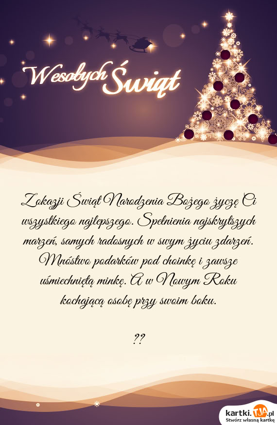 Z okazji Świąt Narodzenia Bożego życzę Ci wszystkiego najlepszego. Spełnienia najskrytszych marzeń, samych radosnych w swym życiu zdarzeń. Mnóstwo podarków pod choinkę i zawsze uśmiechniętą minkę. A w Nowym Roku kochającą osobę przy swoim boku.