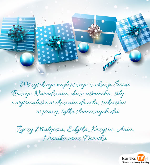 Wszystkiego najlepszego z okazji Świąt Bożego Narodzenia, dużo uśmiechu, siły i wytrwałości w dążeniu do celu, sukcesów