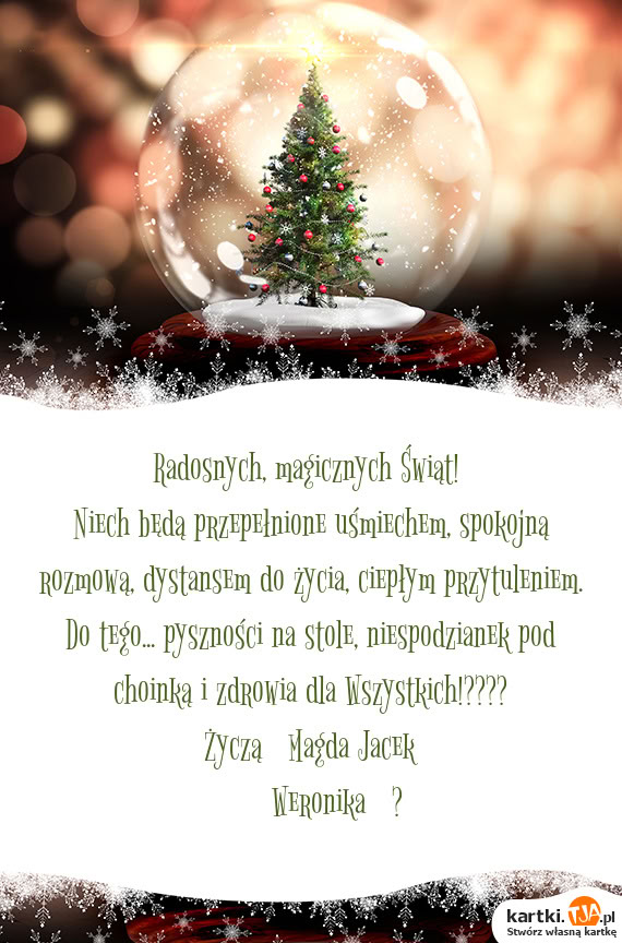 Niech będą przepełnione uśmiechem, spokojną rozmową, dystansem do życia, ciepłym przytuleniem. Do tego... pyszności na stole, niespodzianek pod choinką i zdrowia dla Wszystkich!????