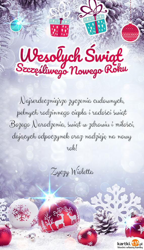 Najserdeczniejsze życzenia cudownych, pełnych rodzinnego ciepła i radości świąt Bożego Narodzenia, świąt w zdrowiu i miłości, dających odpoczynek oraz nadzieję na nowy rok!