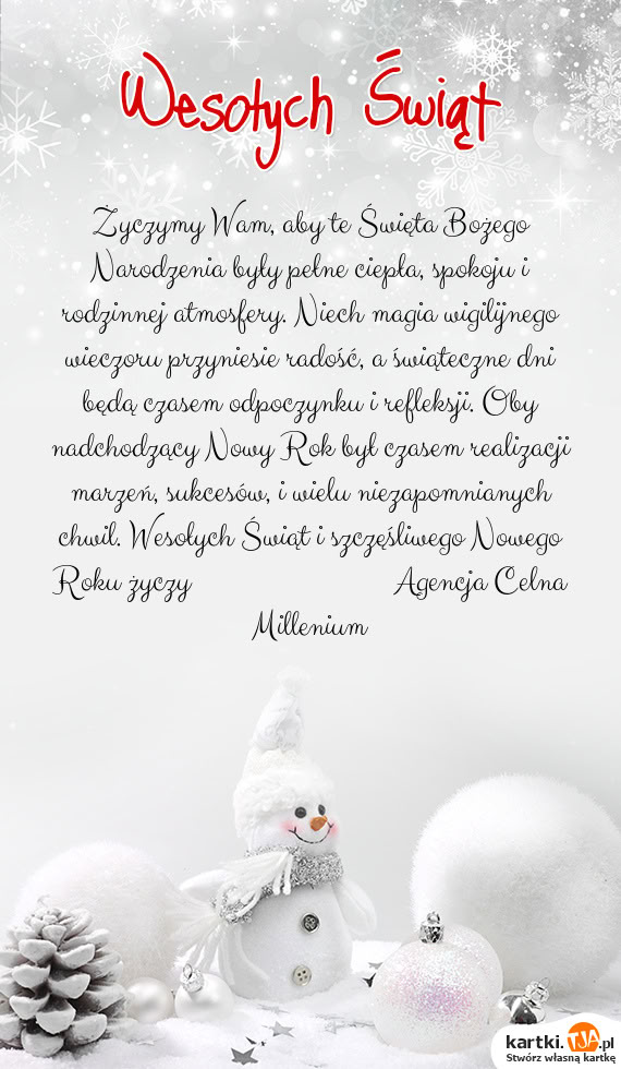 Życzymy Wam, aby te Święta Bożego Narodzenia były pełne ciepła, spokoju i rodzinnej atmosfery. Niech magia wigilijnego wieczoru przyniesie radość, a świąteczne dni będą czasem odpoczynku i refleksji. Oby nadchodzący Nowy Rok był czasem realizacji marzeń, sukcesów, i wielu niezapomnianych chwil. Wesołych Świąt i szczęśliwego Nowego Roku życzy Agencja Celna Millenium