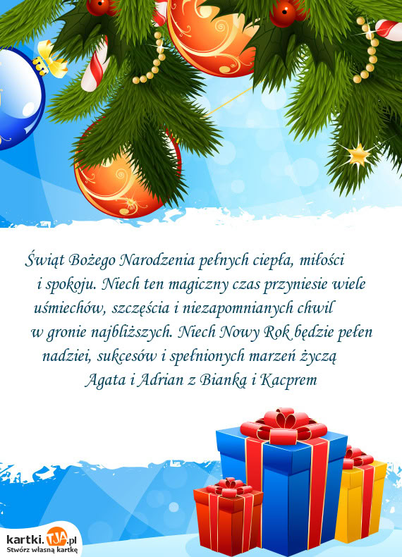 Świąt Bożego Narodzenia pełnych ciepła, miłości i spokoju. Niech ten magiczny czas przyniesie wiele uśmiechów, szczęścia i niezapomnianych chwil w gronie najbliższych. Niech Nowy Rok będzie pełen nadziei, sukcesów i spełnionych marzeń życzą Agata i Adrian z Bianką i Kacprem