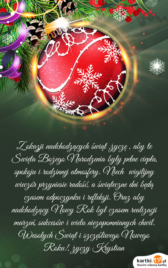 Z okazji nadchodzących świąt ,życzę , aby te Święta Bożego Narodzenia były pełne ciepła, spokoju i rodzinnej atmosfery. Niech wigilijny wieczór przyniesie radość, a świąteczne dni będą czasem odpoczynku i refleksji. Oraz aby nadchodzący Nowy Rok był czasem realizacji marzeń, sukcesów i wielu niezapomnianych chwil. Wesołych Świąt i szczęśliwego Nowego Roku!, życzy Krystian