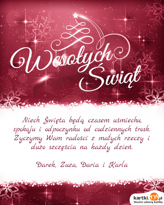 Niech Święta będą czasem uśmiechu, spokoju i odpoczynku od codziennych trosk. Życzymy Wam radości z małych rzeczy i dużo szczęścia na każdy dzień.