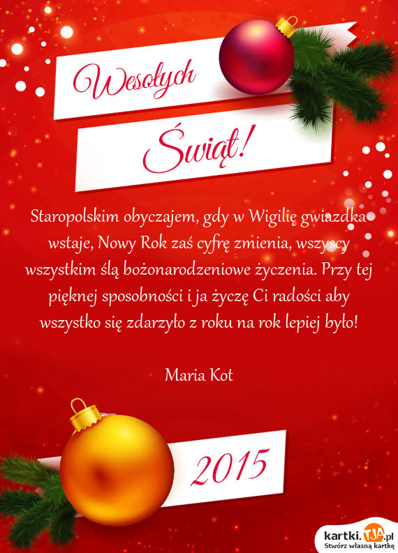 Staropolskim obyczajem, gdy w Wigilię gwiazdka wstaje, Nowy Rok zaś cyfrę zmienia, wszyscy wszystkim ślą bożonarodzeniowe życzenia. Przy tej pięknej sposobności i ja życzę Ci radości aby wszystko się zdarzyło z roku na rok lepiej było!