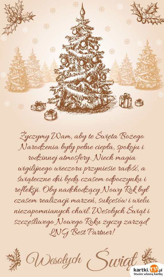 Życzymy Wam, aby te Święta Bożego Narodzenia były pełne ciepła, spokoju i rodzinnej atmosfery. Niech magia wigilijnego wieczoru przyniesie radość, a świąteczne dni będą czasem odpoczynku i refleksji. Oby nadchodzący Nowy Rok był czasem realizacji marzeń, sukcesów i wielu niezapomnianych chwil. Wesołych Świąt i szczęśliwego Nowego Roku życzy zarząd LNG Best Partner!