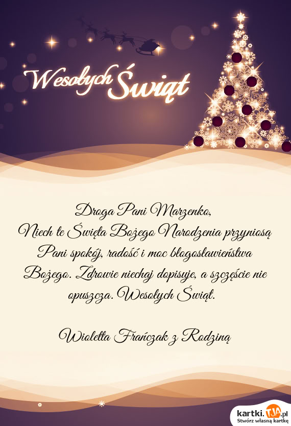 Niech te Święta Bożego Narodzenia przyniosą Pani spokój, radość i moc błogosławieństwa Bożego. Zdrowie niechaj dopisuje, a szczęście nie opuszcza. Wesołych Świąt.