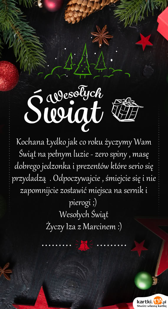Kochana Łydko jak co roku życzymy Wam Świąt na pełnym luzie - zero spiny , masę dobrego jedzonka i prezentów które serio się przydadzą . Odpoczywajcie , śmiejcie się i nie zapomnijcie zostawić miejsca na sernik i pierogi ;)