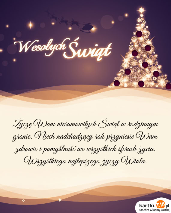Życzę Wam niesamowitych Świąt w rodzinnym gronie. Niech nadchodzący rok przyniesie Wam zdrowie i pomyślność we wszystkich sferach życia. Wszystkiego najlepszego życzy Wiola.