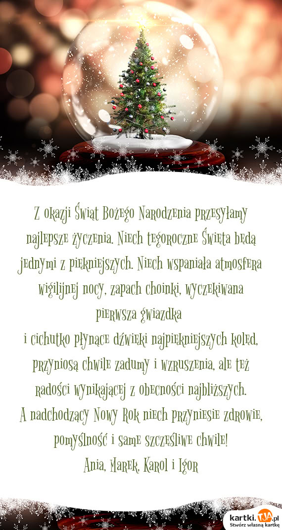 Z okazji Świąt Bożego Narodzenia przesyłamy najlepsze życzenia. Niech tegoroczne Święta będą jednymi z piękniejszych. Niech wspaniała atmosfera wigilijnej nocy, zapach choinki, wyczekiwana pierwsza gwiazdka